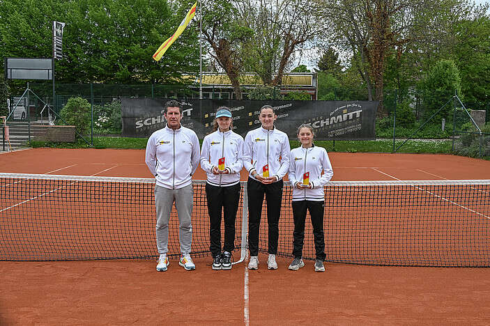 (v. li.) Sascha Müller (Verbandstrainer), Amy Waschulewski (TC Andernach), Mia Keuler und Emily Eigelsbach (HTC Bad Neuenahr)